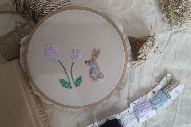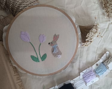 Crie uma peça delicada e encantadora com o bordado Jardim do Coelhinho. Com elementos botânicos suaves e traços minimalistas, este design transmite leveza e elegância. É a escolha perfeita para um momento de bordado consciente e uma adição belíssima para a decoração da sua casa ou para presentear nesta Páscoa.